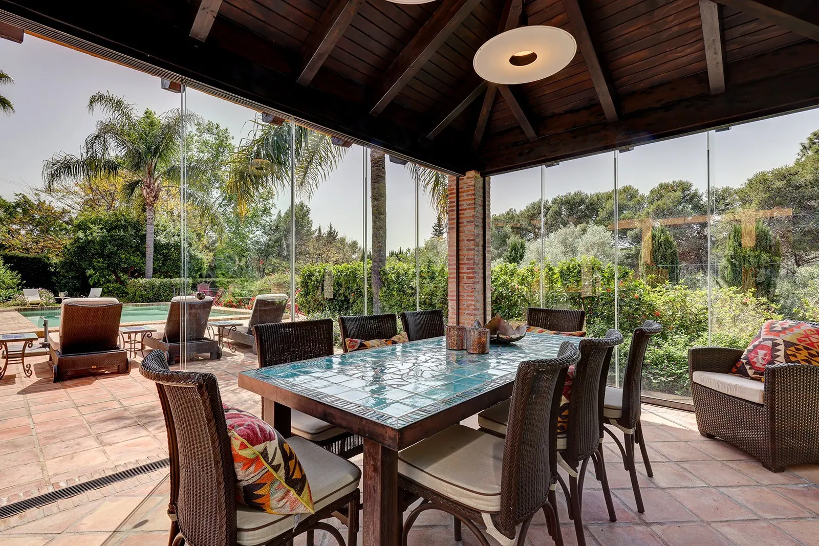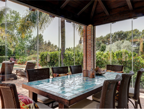 The property, which is very private, is 3500 sqm and is planted with beautiful bushes, fruit trees, and flowers. The villa has a living area of 350 sqm plus covered terraces. In the garden, there is a beautiful outdoor lounge (chiringuito) with glass sliding doors, a dining table, and a fireplace, facing terraced areas with sun loungers and a heated swimming pool.