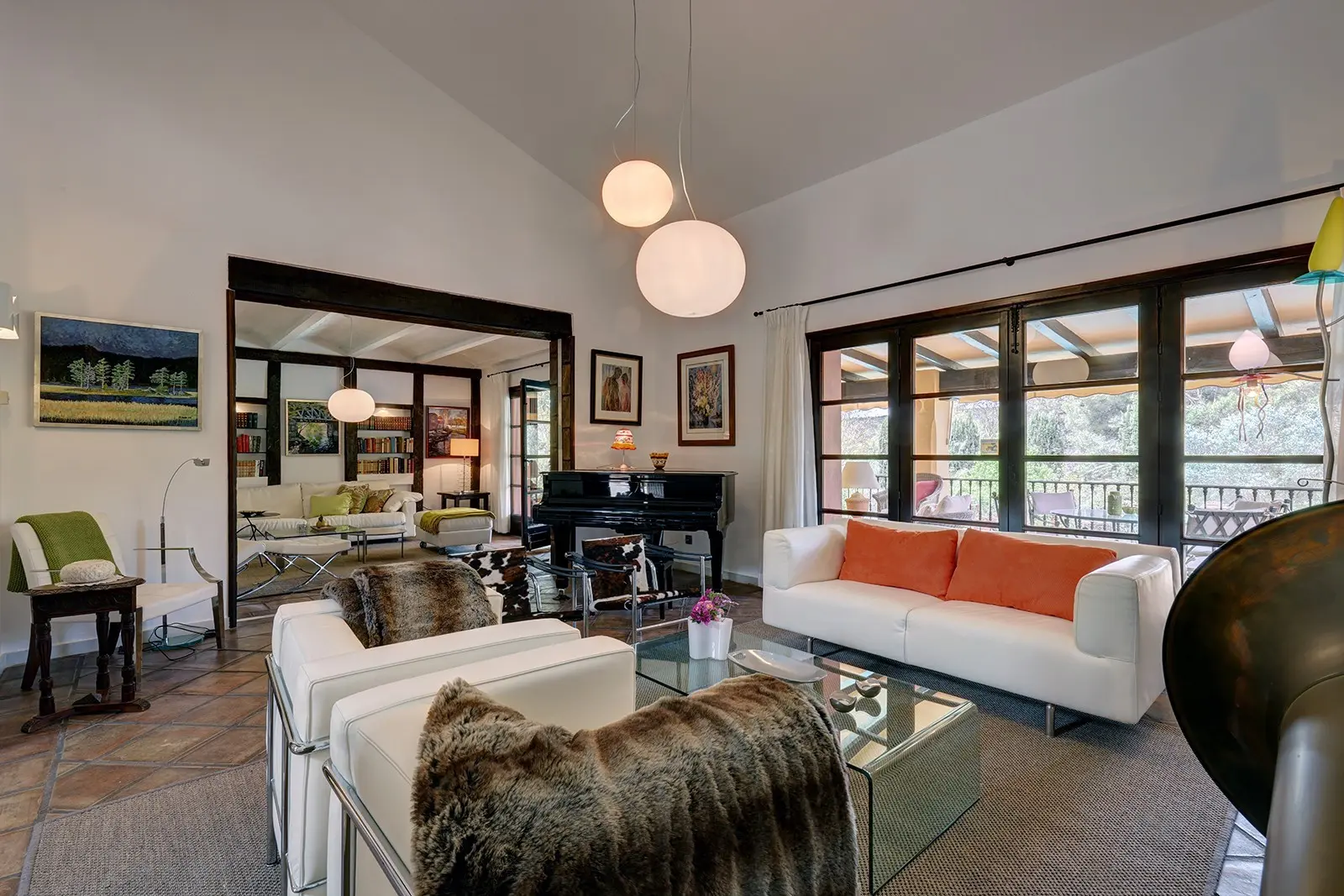 The furniture is of high standard, modern, and stylish, and there is a beautiful grand piano. Additionally, there is a fireplace and a TV with Apple TV in the living rooms.